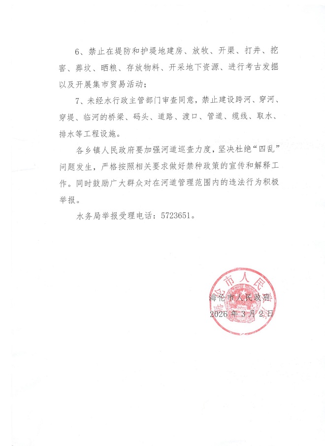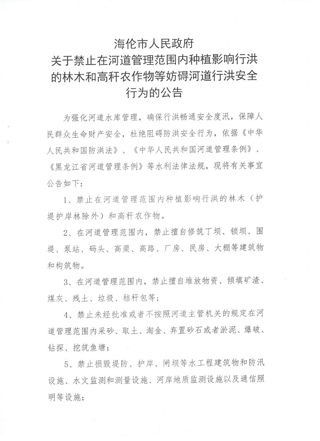 海伦市人民政府关于禁止在河道管理范围内种植影响行洪的林木和高秆农作物等妨碍河道行洪安全行为的公告
