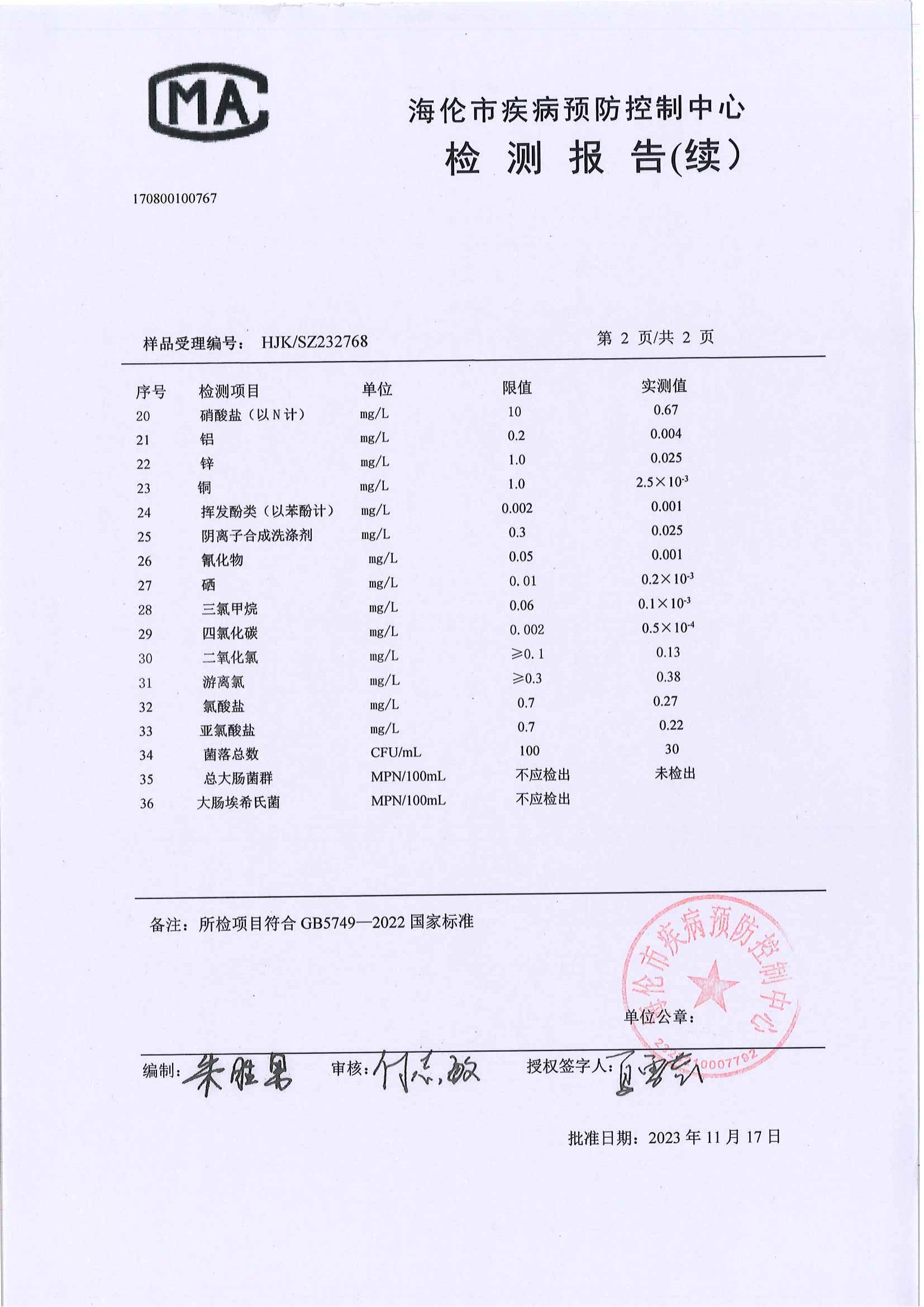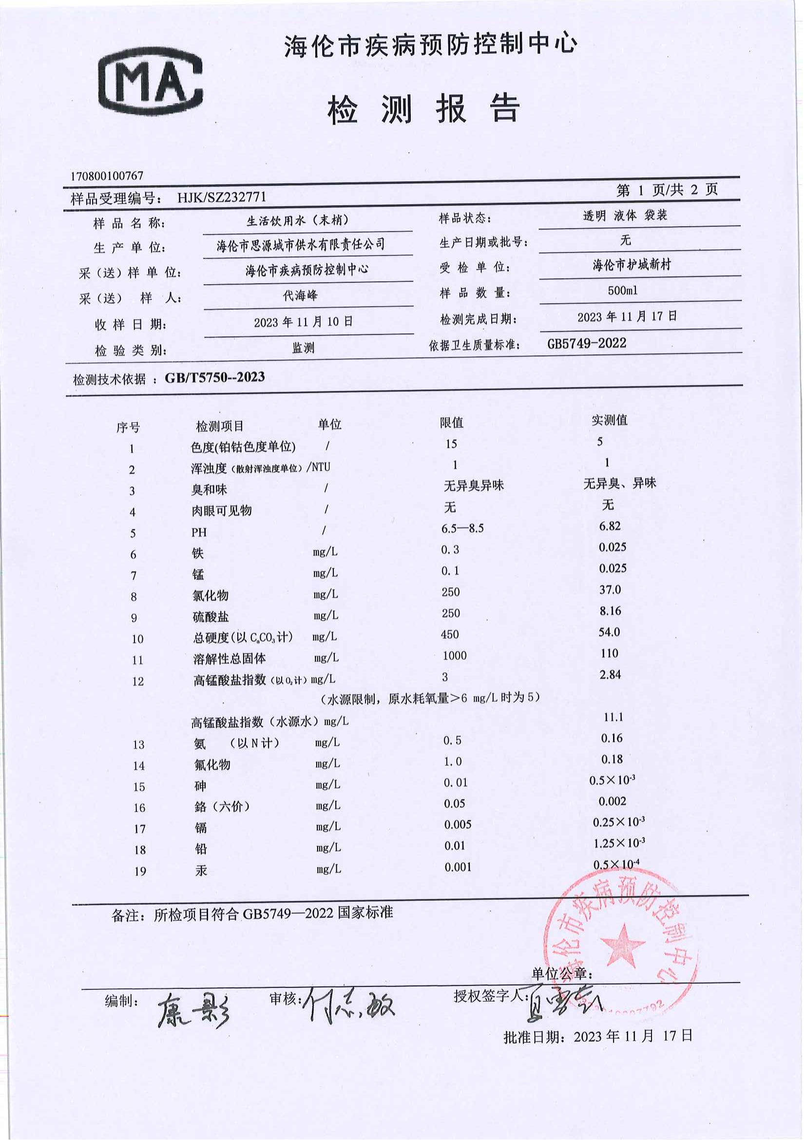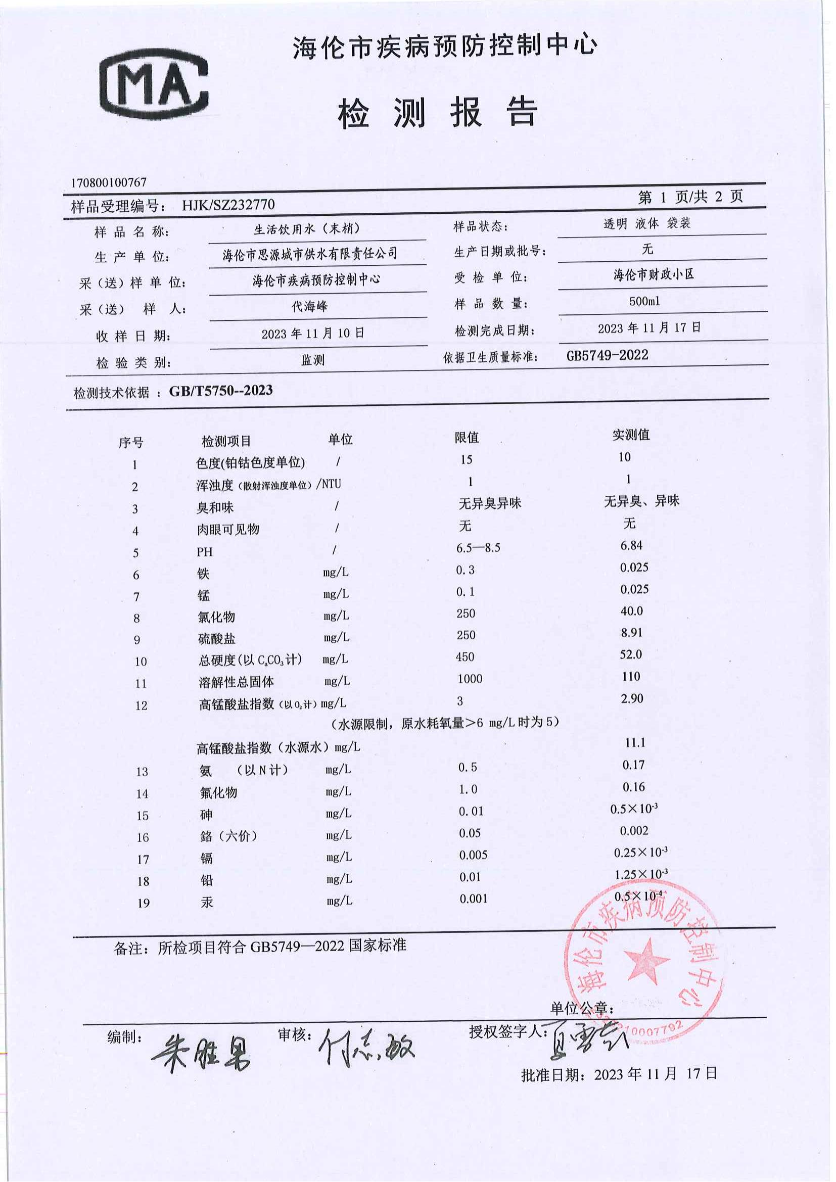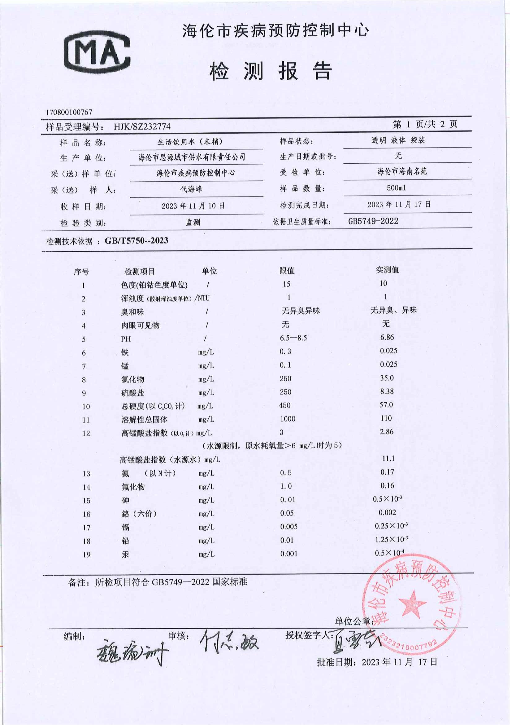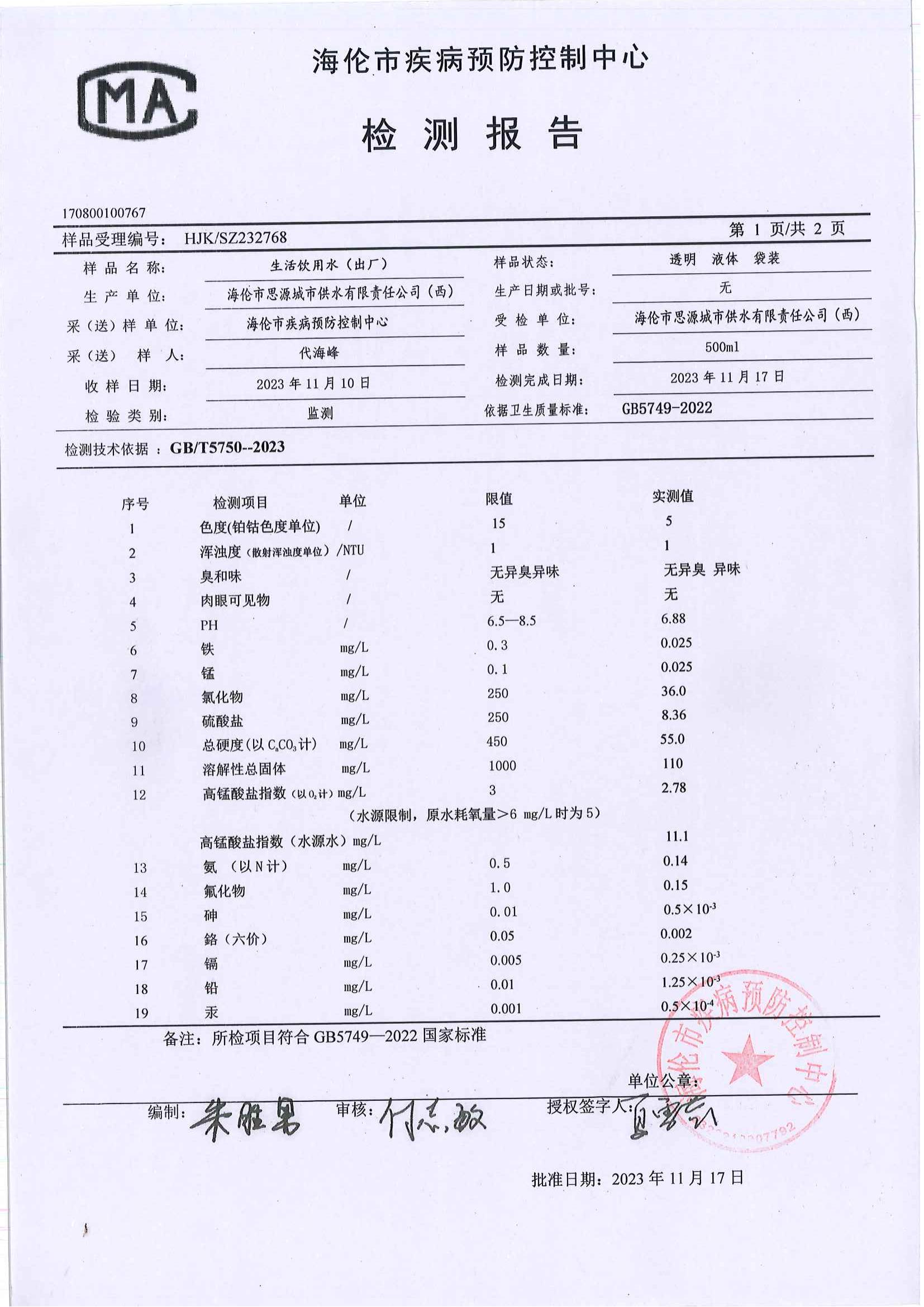 经海伦市疾病预防控制中心2023年11月17日对出厂水和末梢水多地抽样检测,海伦市城区内生活饮用水所检测项目的检测结果均符合国家《生活饮用水卫生标准》(GB5749-2022)。