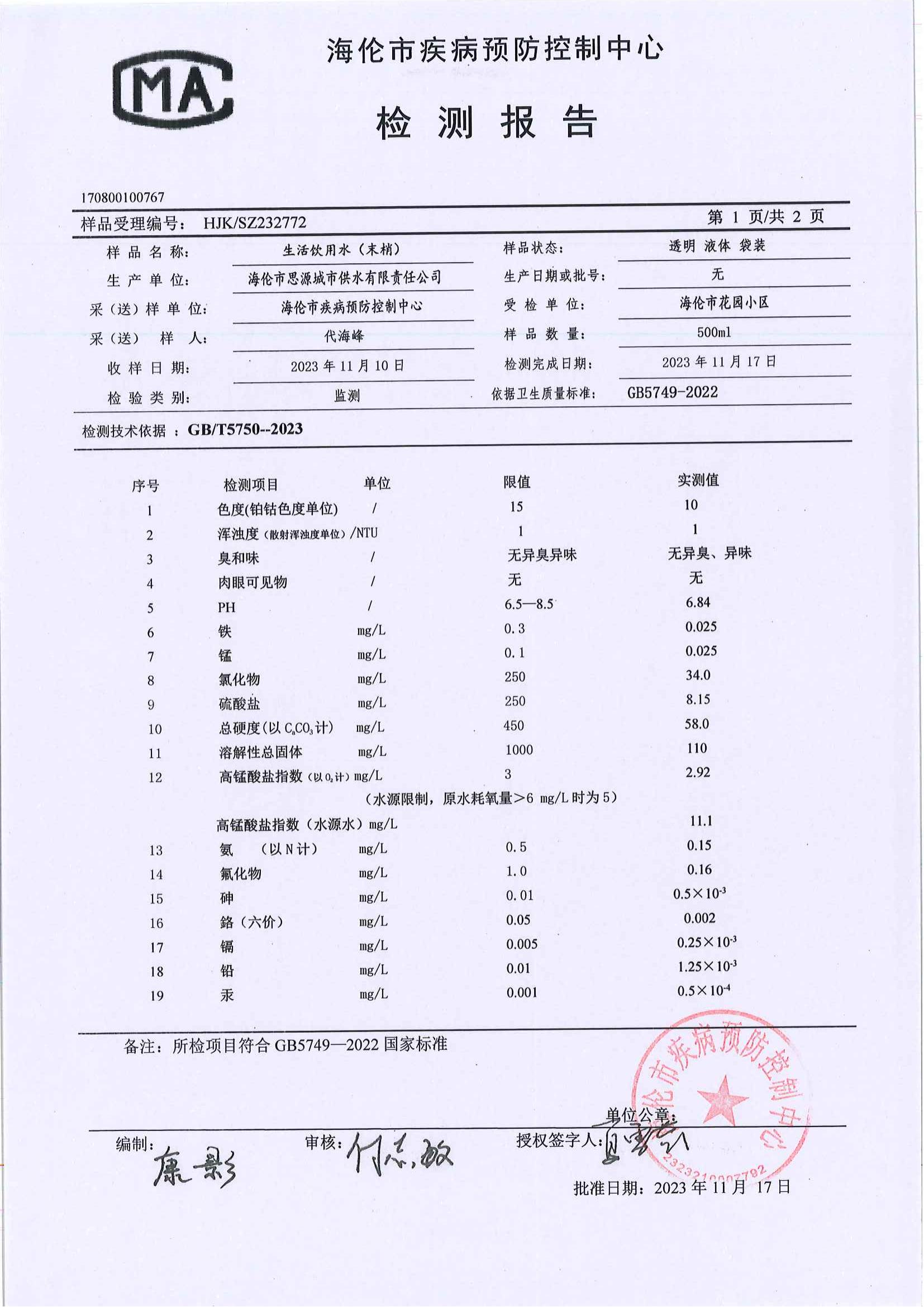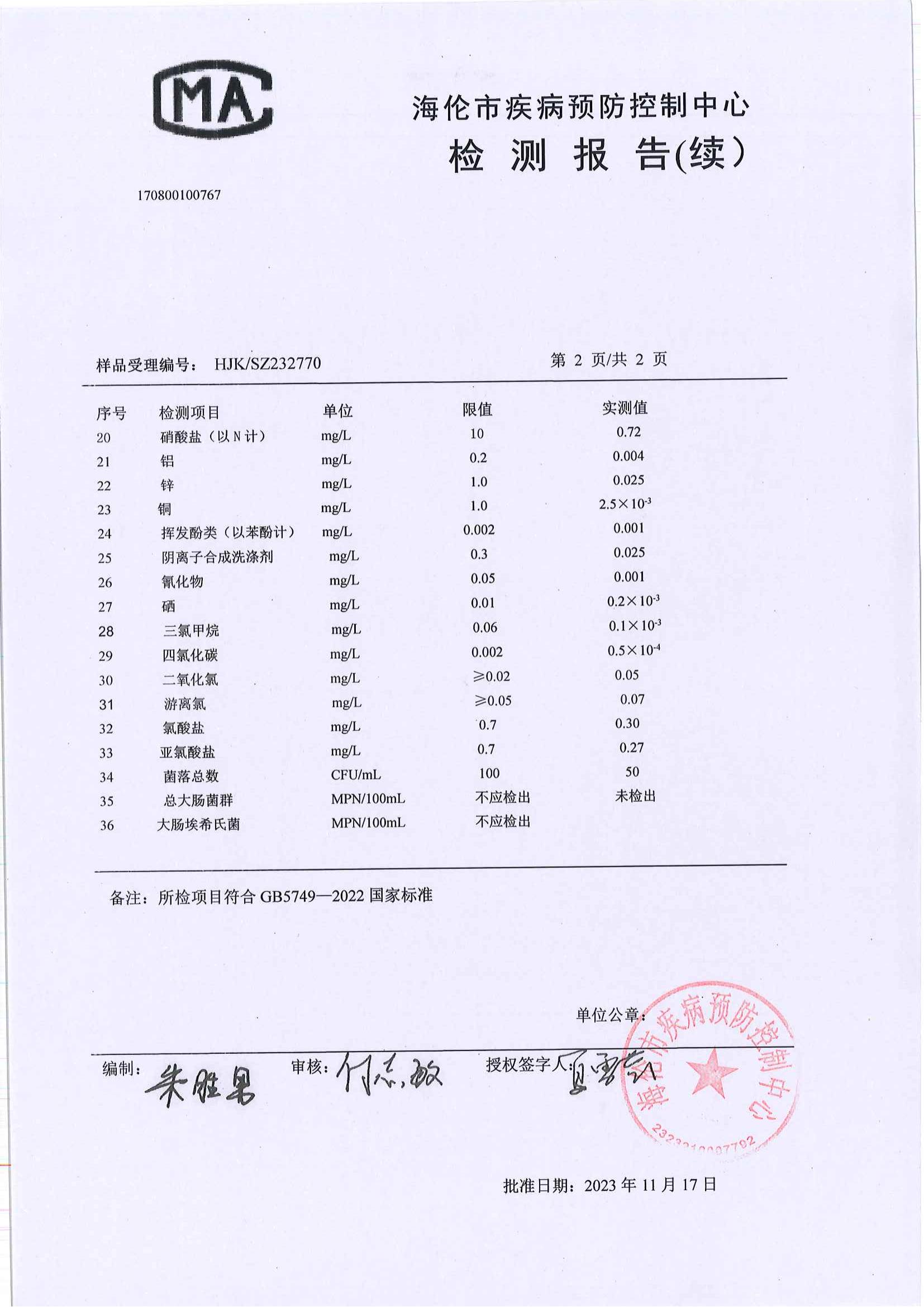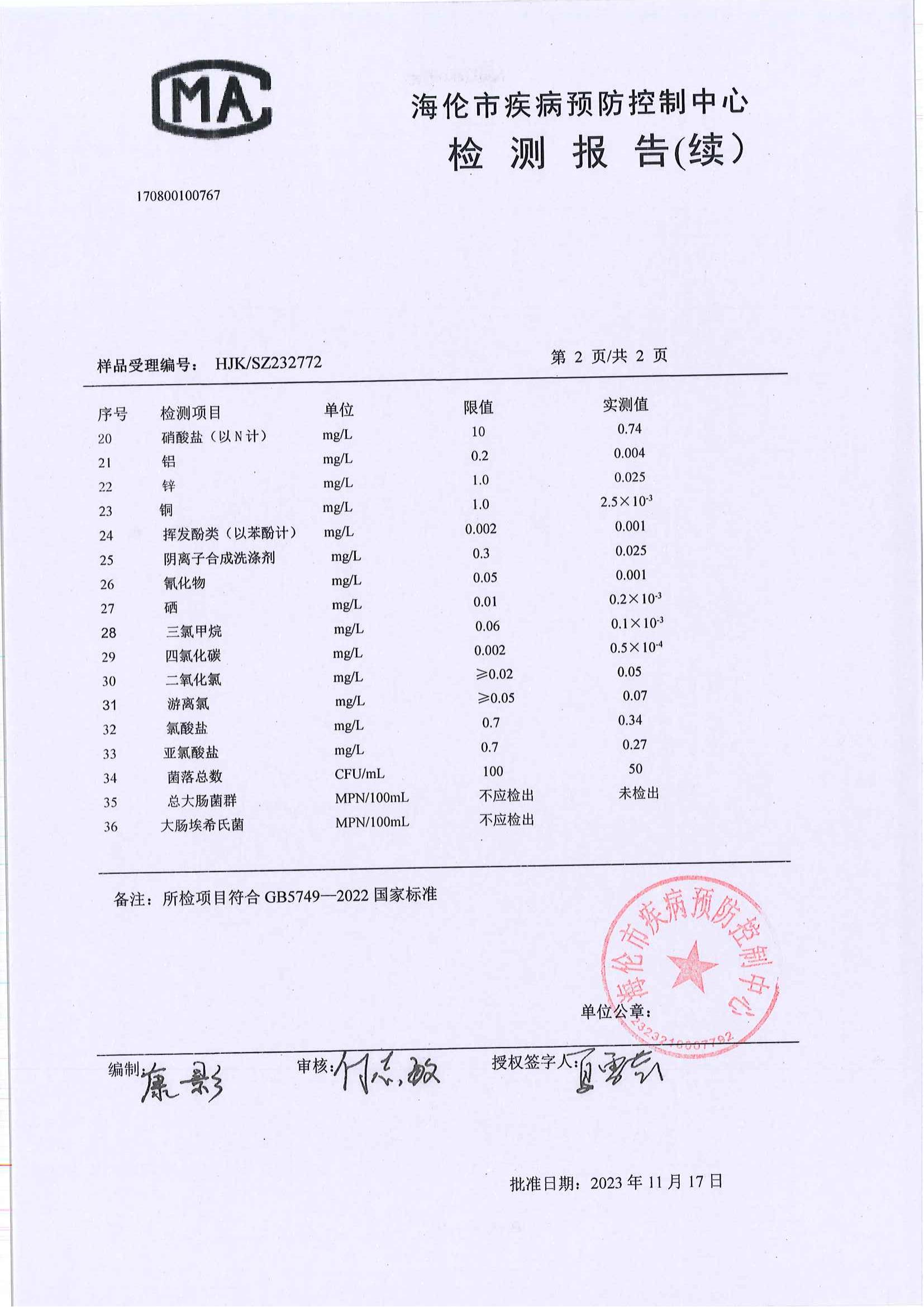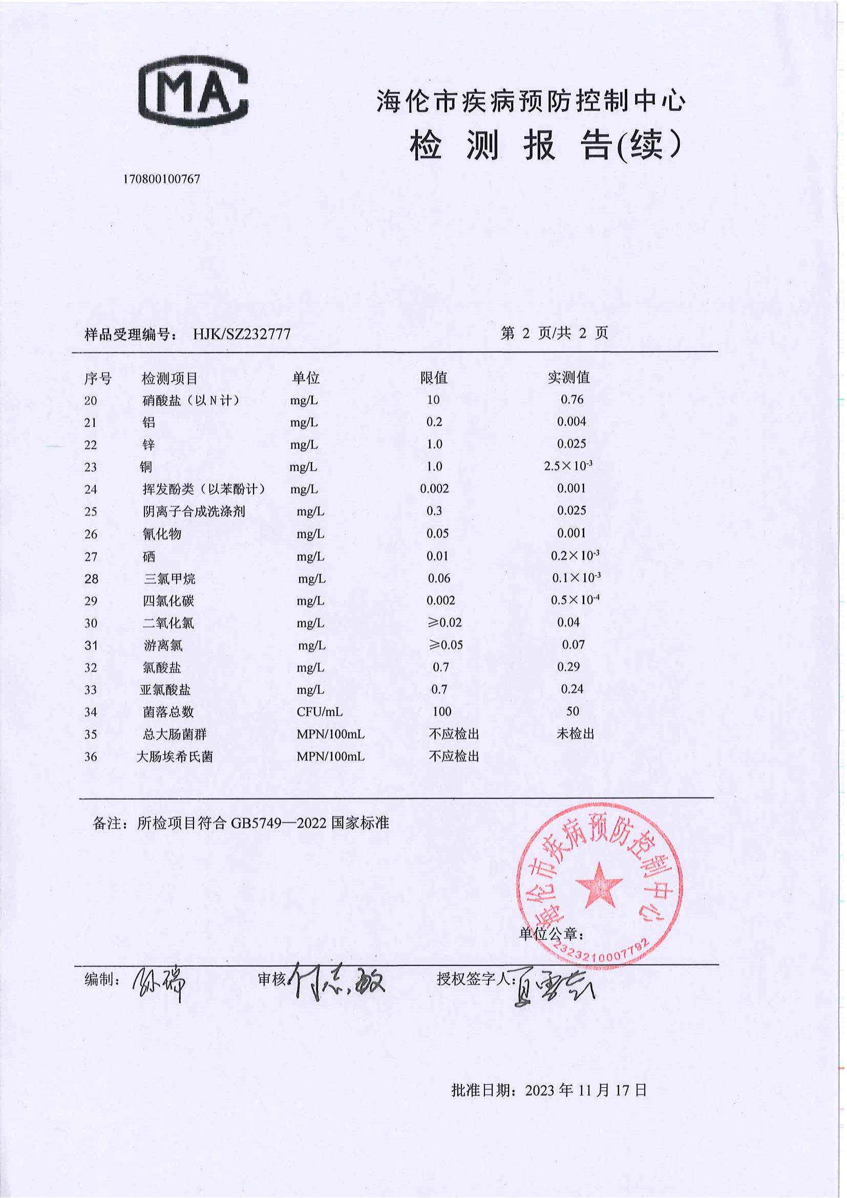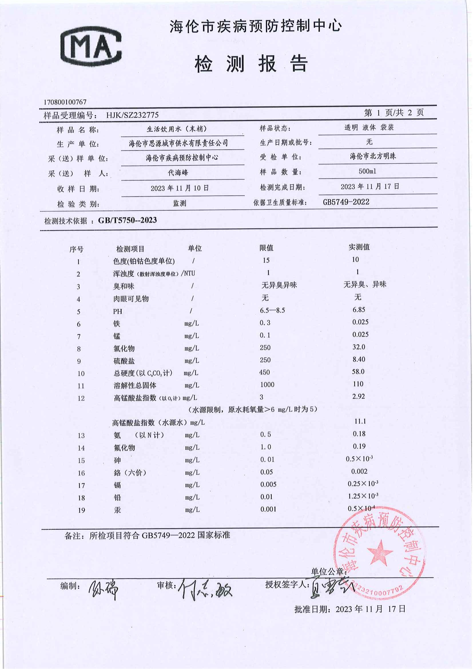 经海伦市疾病预防控制中心2023年11月17日对出厂水和末梢水多地抽样检测,海伦市城区内生活饮用水所检测项目的检测结果均符合国家《生活饮用水卫生标准》(GB5749-2022)。