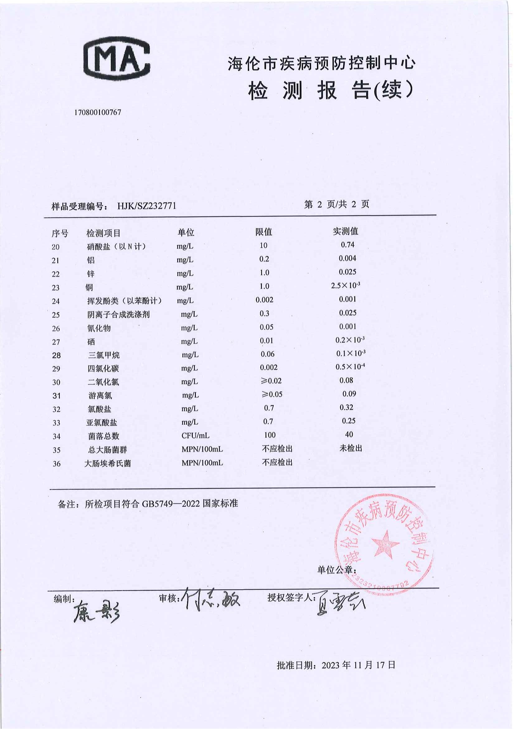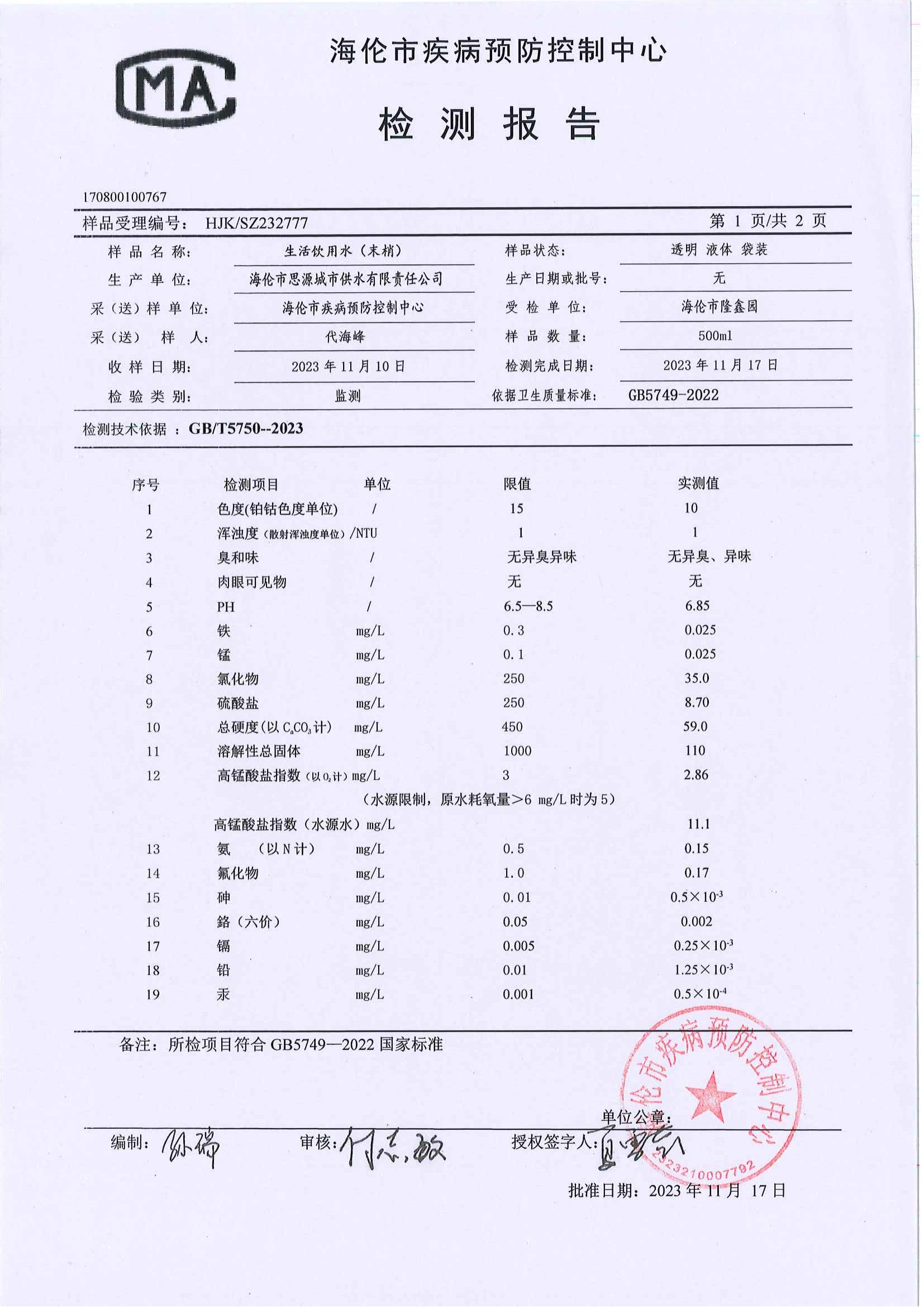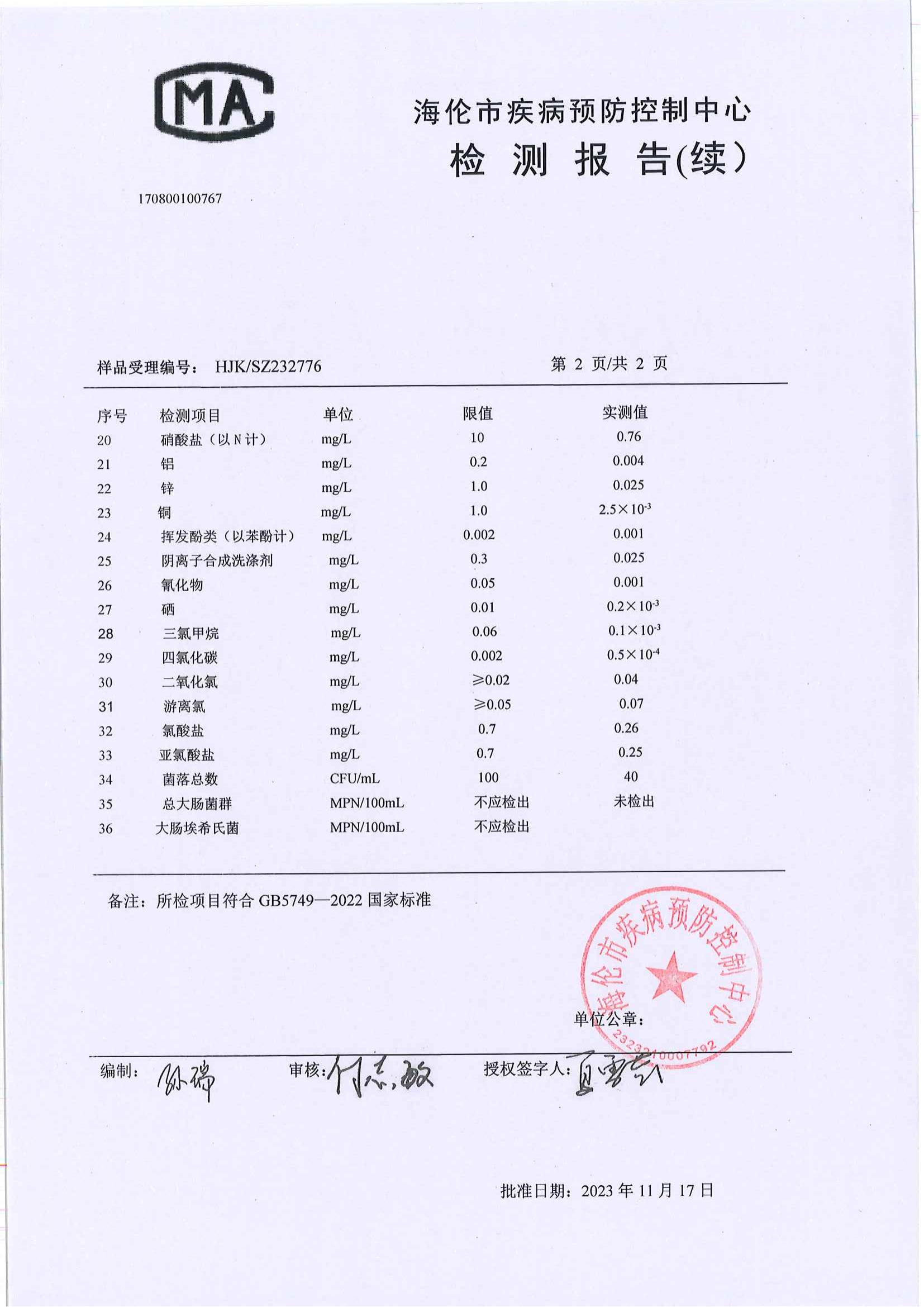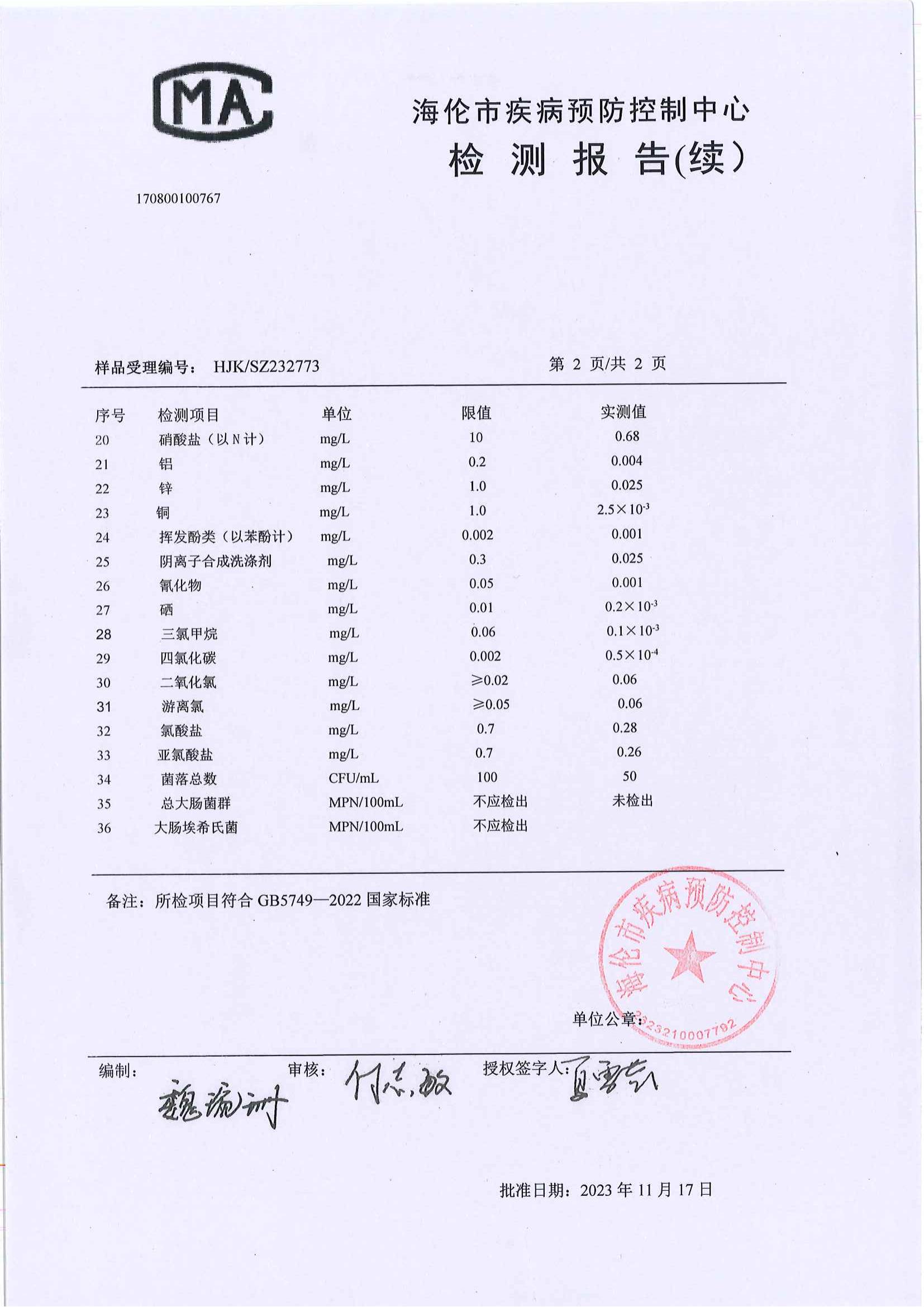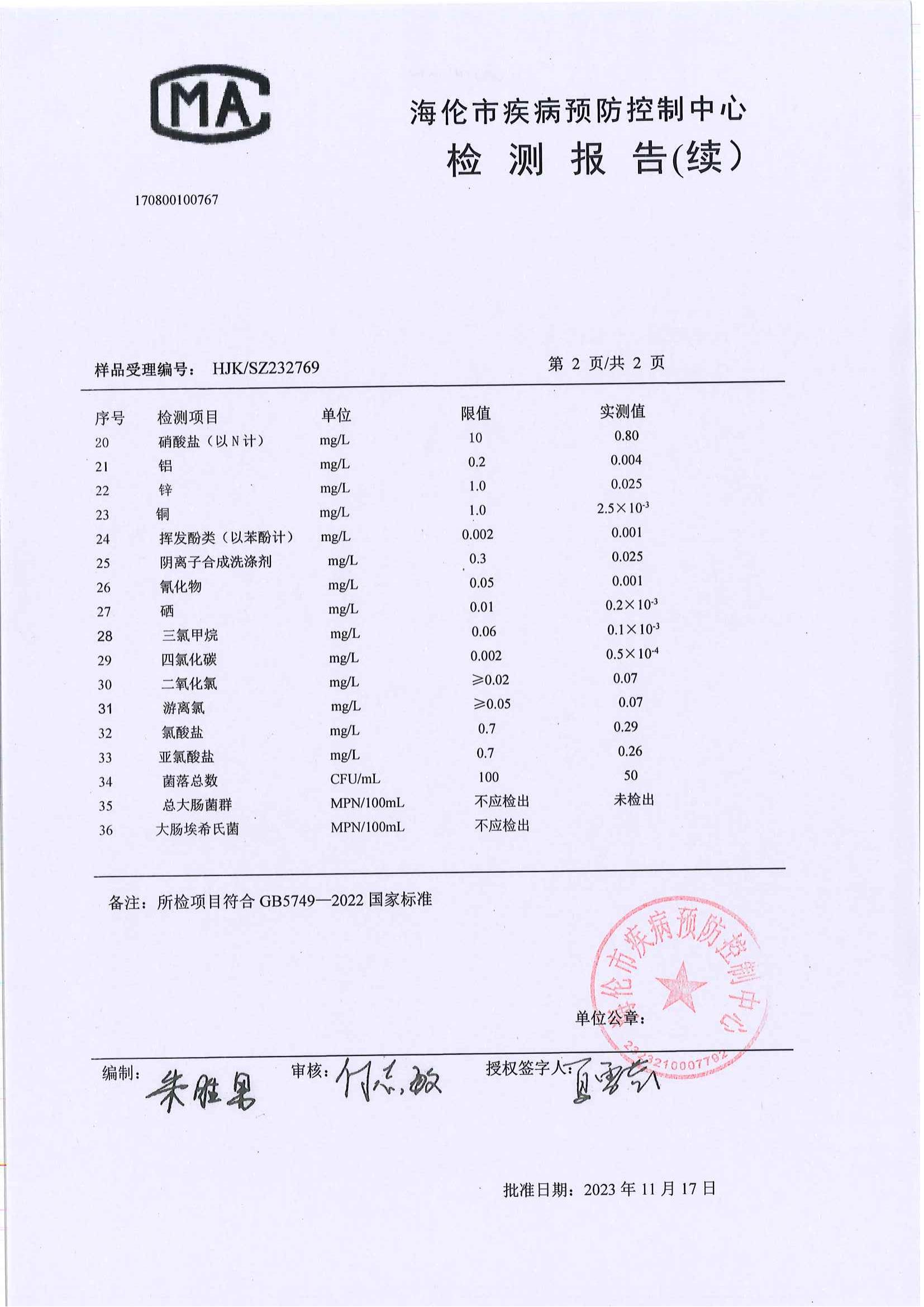 经海伦市疾病预防控制中心2023年11月17日对出厂水和末梢水多地抽样检测,海伦市城区内生活饮用水所检测项目的检测结果均符合国家《生活饮用水卫生标准》(GB5749-2022)。