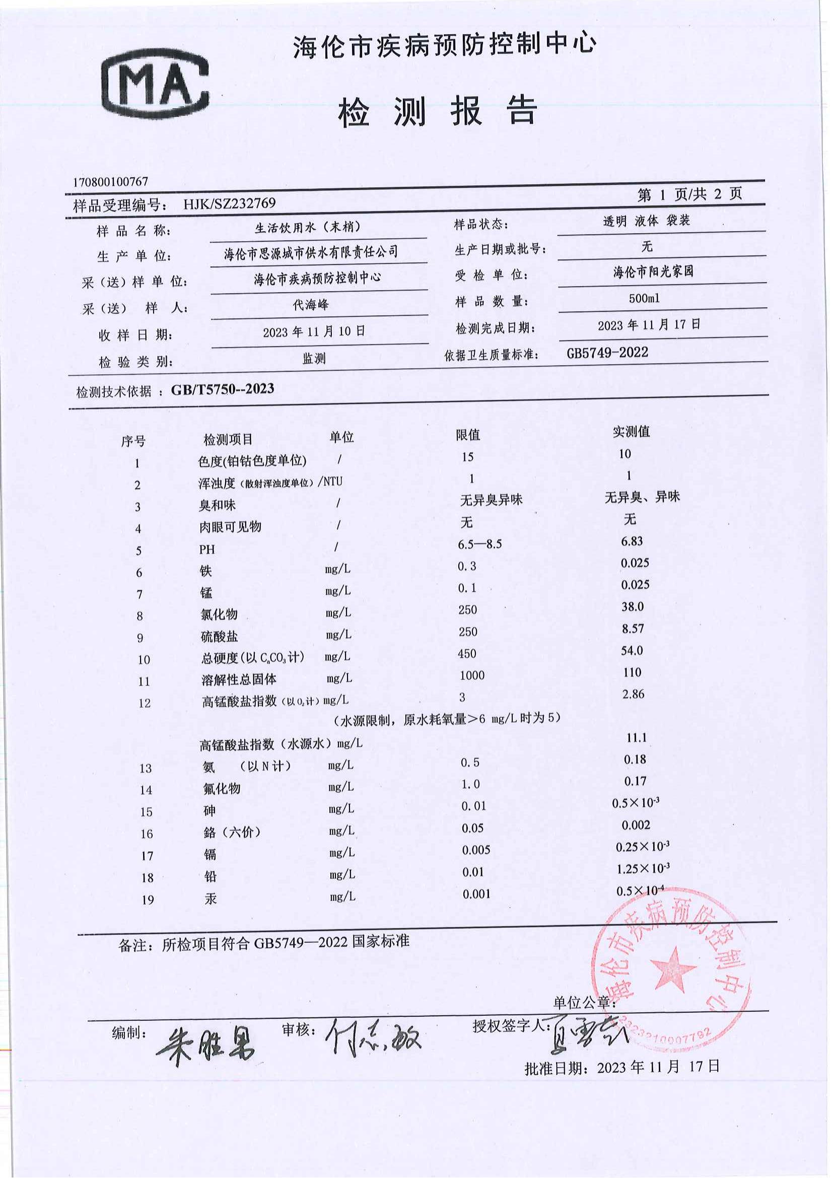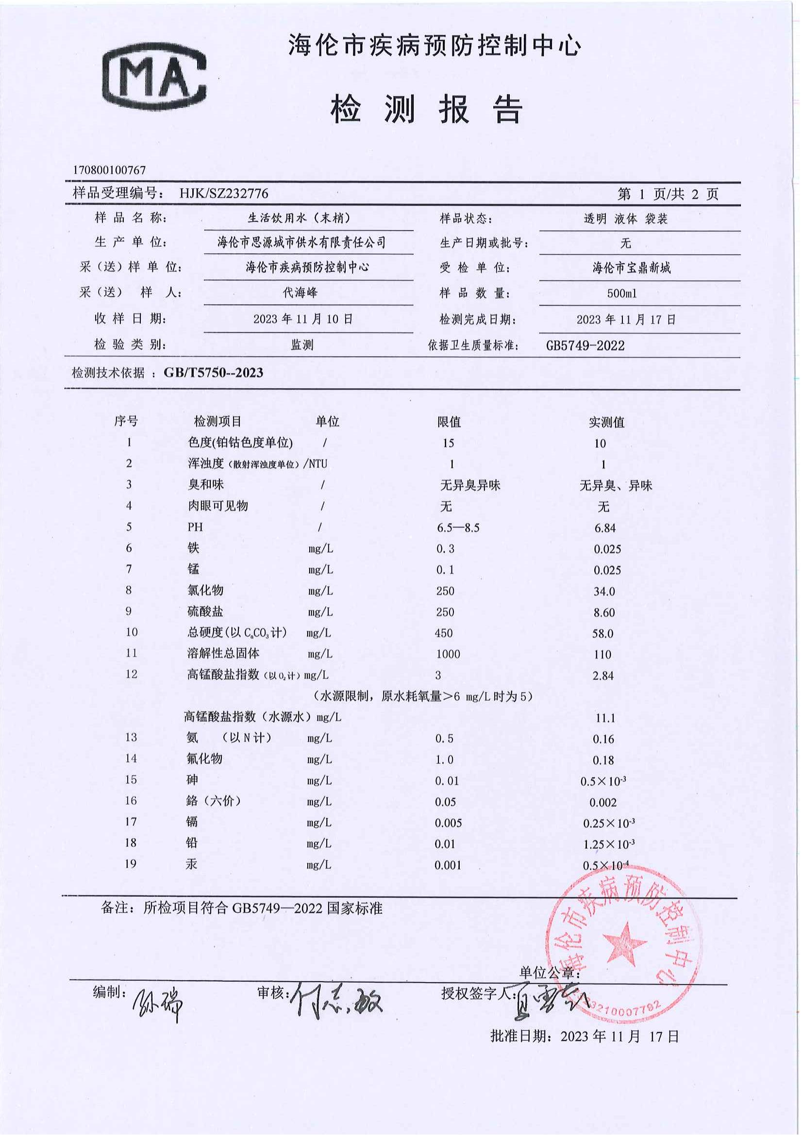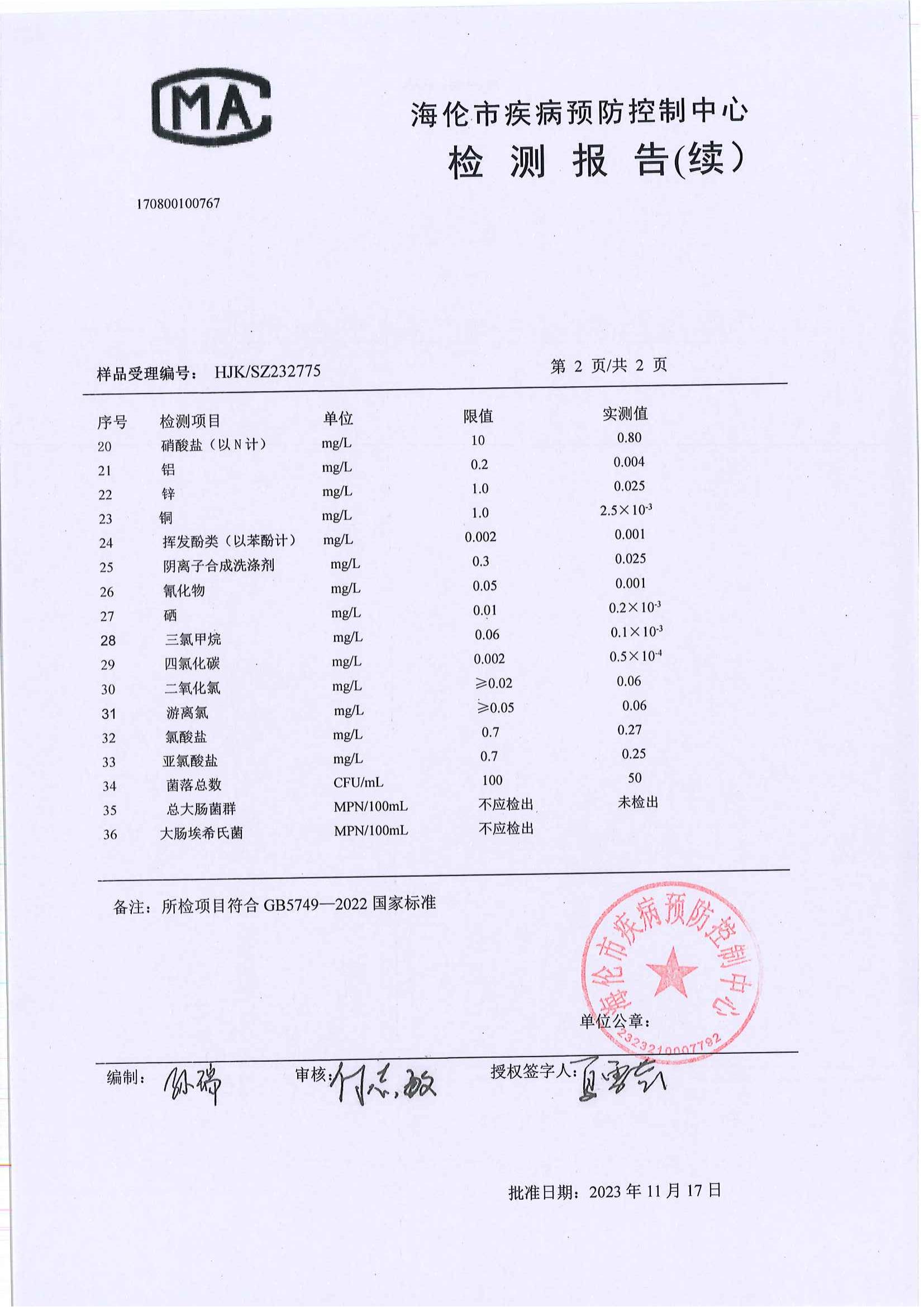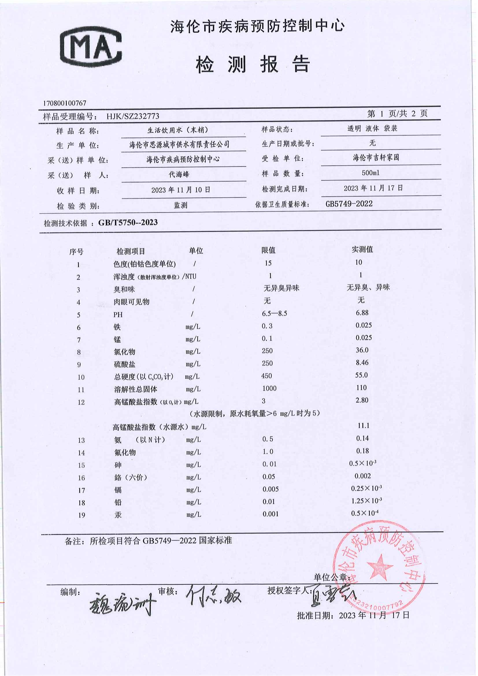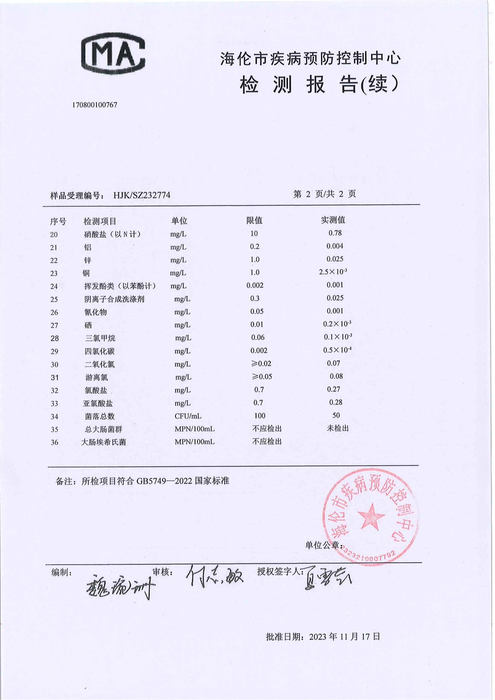 经海伦市疾病预防控制中心2023年11月17日对出厂水和末梢水多地抽样检测,海伦市城区内生活饮用水所检测项目的检测结果均符合国家《生活饮用水卫生标准》(GB5749-2022)。